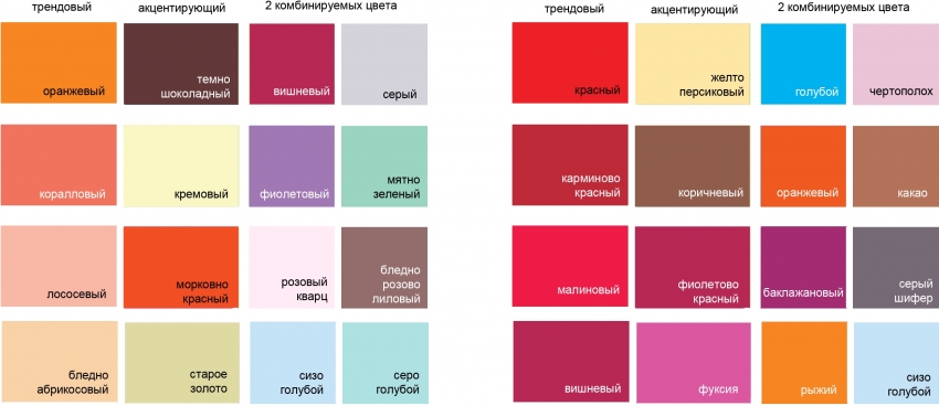 Многие задаются вопросом о том, как же пользоваться таблицей сочетания цветов в интерьере? Иногда это сложно и не совсем удобно. Ниже представлены таблицы сочетания цветов в доступном и понятном виде, где расписаны все популярные оттенки. Трендовый цвет — основной, далее идут подходящие к нему цвета, которые можно смело комбинировать. Акцентирующий цвет придаст интерьеру яркости и креативности.