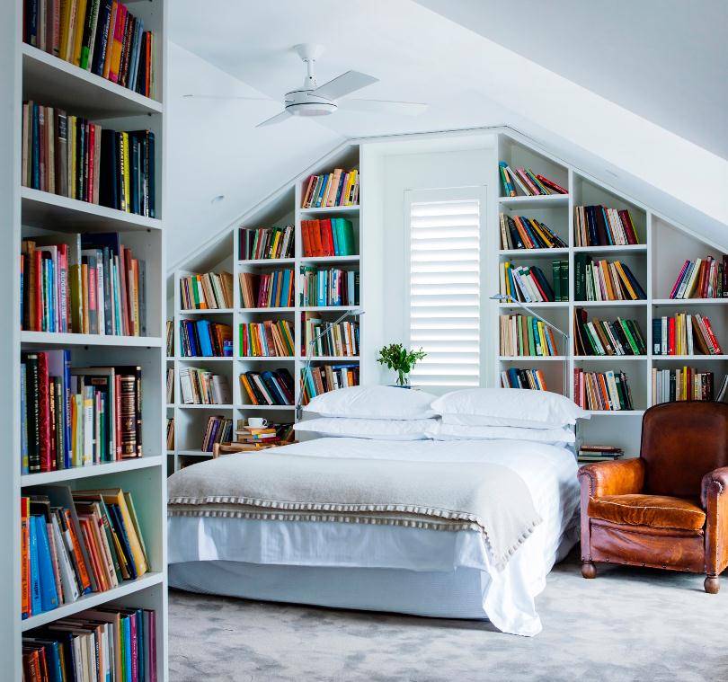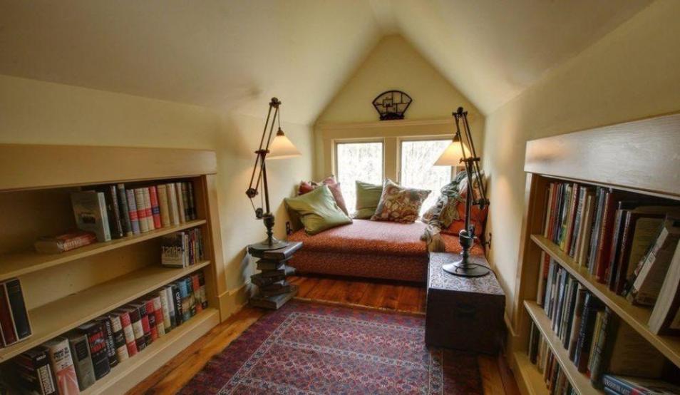 Если нет ограничений по площади, то мансарду можно обустроить большим количеством книжных стеллажей.