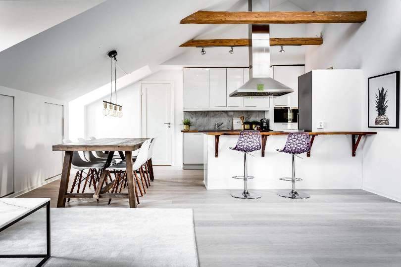 В случае, если нужно спускать и поднимать тяжелые пакеты с продуктами, то расположение кухни на чердачном этаже неудобно