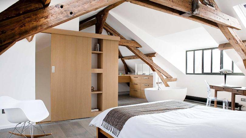 Впрочем, вовсе не обязательно иметь прозрачную перегородку, ведь если в мансарде 2 комнаты, то обе они могут стать абсолютно автономными помещениями, например, уединенной спальней, как представлено на прочих фото подборки, снабженной собственной просторной ванной за стеной или просторной гардеробной своими руками.