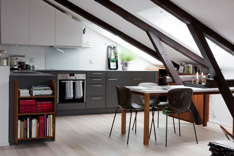 Её на мансардном этаже размещают нечасто. Во-первых, на кухню обязательно придется тянуть водопровод, канализацию, электричество и (возможно) газ. Во-вторых, кухонное помещение одно из самых посещаемых в доме, а ходить туда-обратно попросту неудобно. В-третьих, две стены под углом создают массу проблем с размещением кухонного гарнитура.