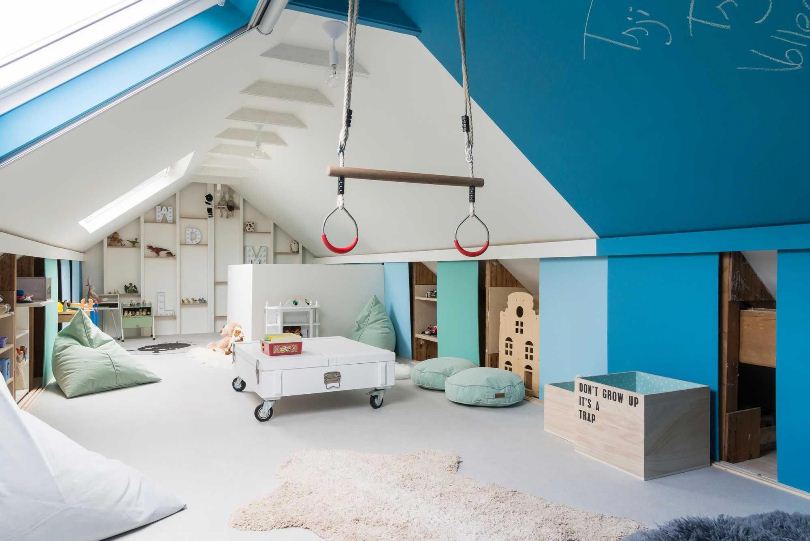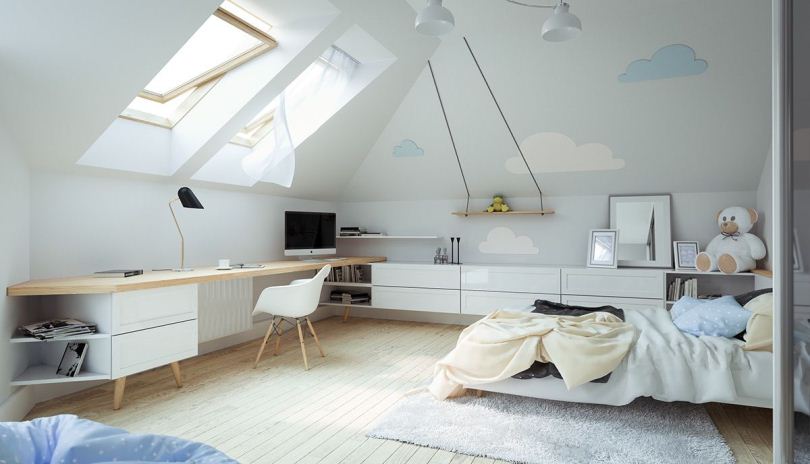 Большинство детей приводит в восторг сама возможность забраться повыше прямо под крышу. В детской комнате на мансарде можно сделать настоящий сказочный мир с замком принцессы или пиратским кораблем. Если делаешь комнату для самых маленьких – главное, позаботься о защите всех острых углов и скошенных потолков, чтобы ребенок не ударился.