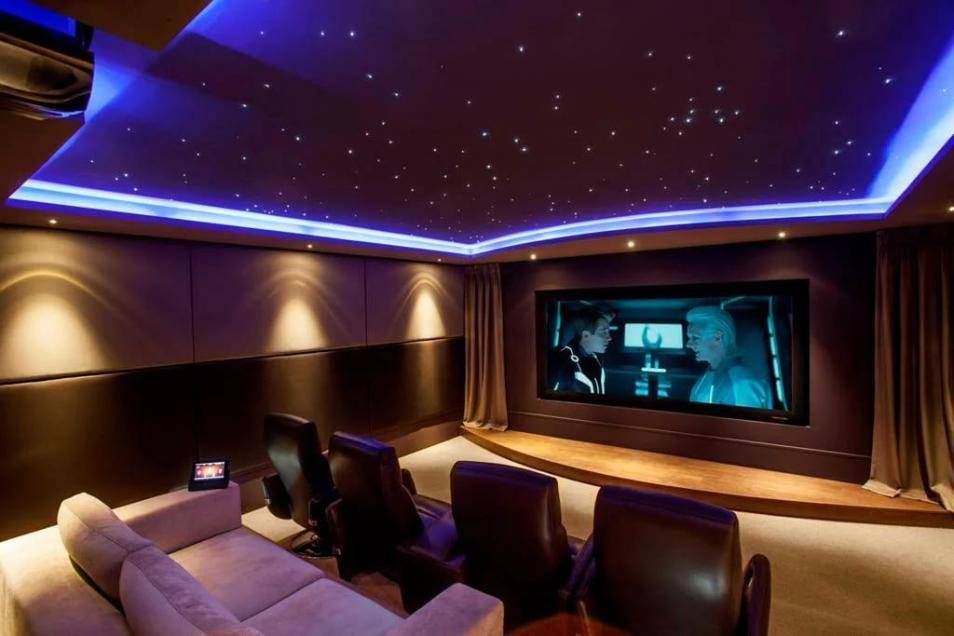 В таком случае следует у небольшой стены разместить мягкий диван, а на противоположной стене нужно расположить все требуемое оборудование. Также следует позаботиться о хорошей звукоизоляции, благодаря этому ничего не будет мешать просмотру фильмов.