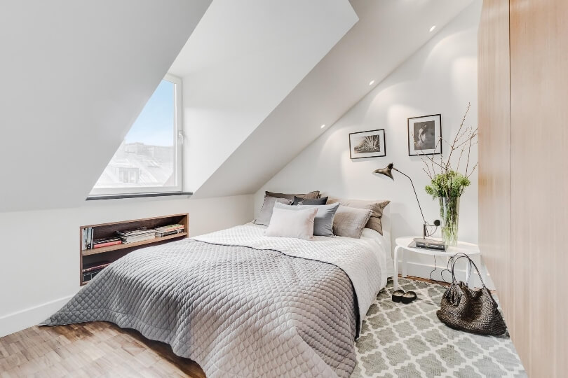 Чтобы визуально расширить границы маленькой спальни на мансарде, рекомендуется использовать светлые оттенки