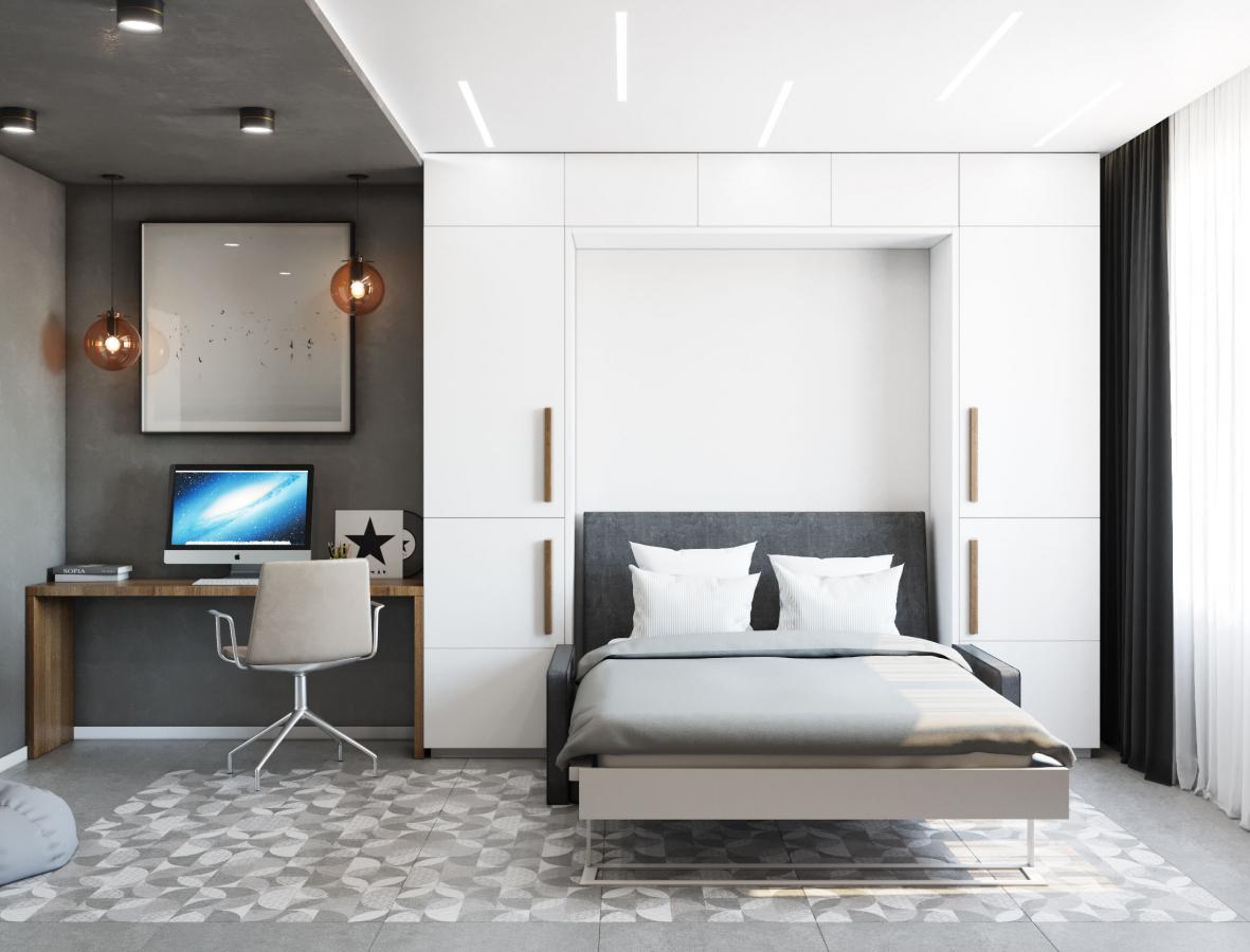 А еще обрати внимание на встроенные конструкции: откидное спальное место из шкафа или выдвижное из подиума