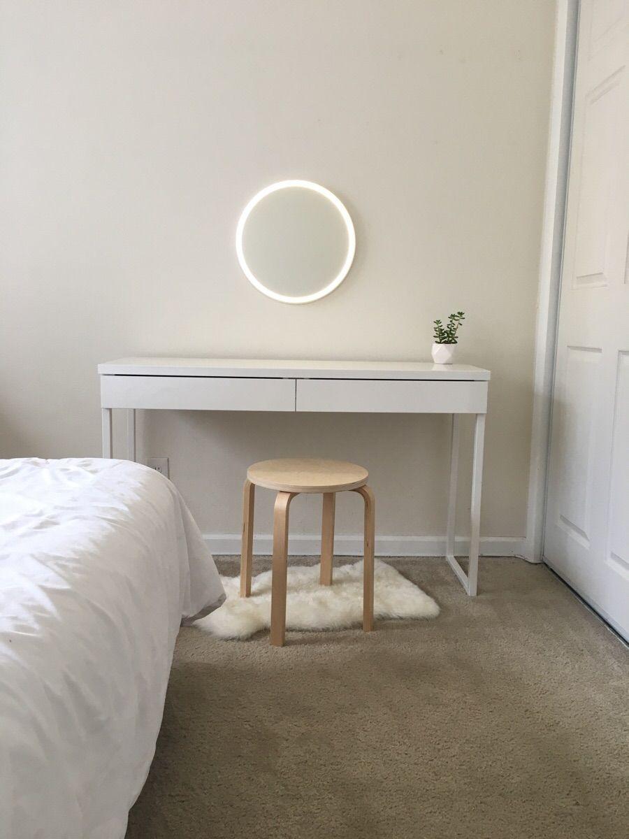 Туалетный столик также должен соответствовать духу минимализма. Разумно выбрать мебель, которая легко раскладывается, предоставляя доступ к баночкам и бутылочкам с косметическими средствами. Например: конструкция с откидной или раздвижной столешницей.