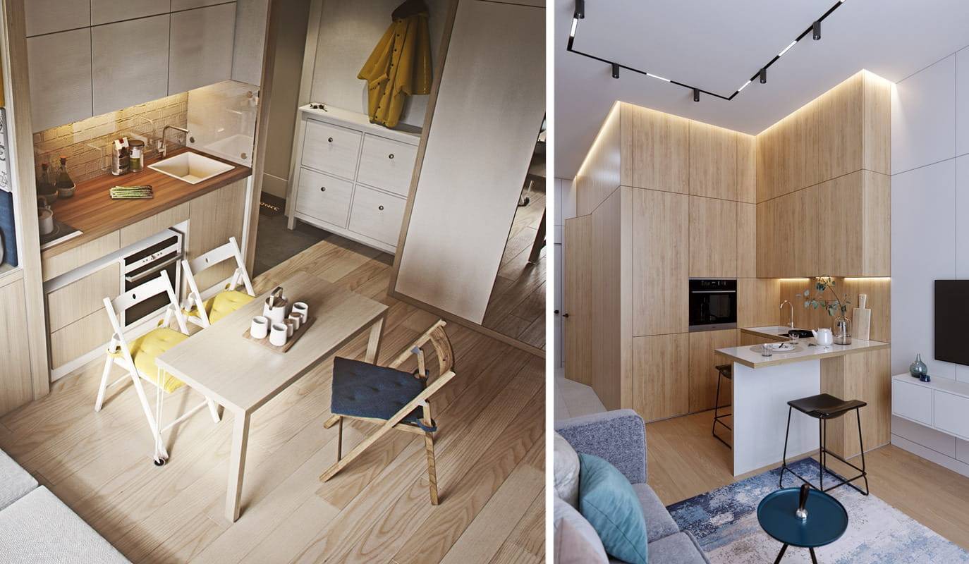 Способ расстановки мебели зависит от архитектурной специфики маленького помещения. Для увеличения площади в дизайне можно применять углубления, ниши, выступы и встраивать кухню.
