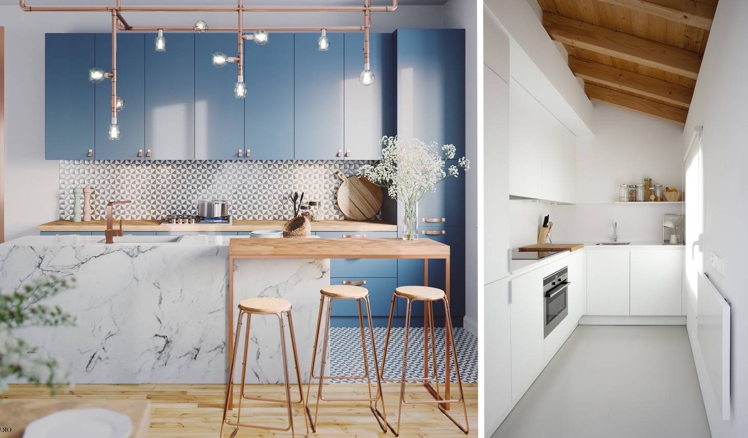 В очень маленькой кухне лучше отказаться от мозаичной плитки, потому что она разделяет и оптически уменьшает интерьер. Также не будем забывать о хорошем освещении. Максимально используйте дневной свет, не закрывая окна узорными шторами или деревянными жалюзи – при необходимости выбирайте более легкие дневные и ночные жалюзи или традиционные светлые жалюзи. Кроме того, не забудьте равномерно разместить искусственное освещение, чтобы каждая часть кухни была правильно освещена.