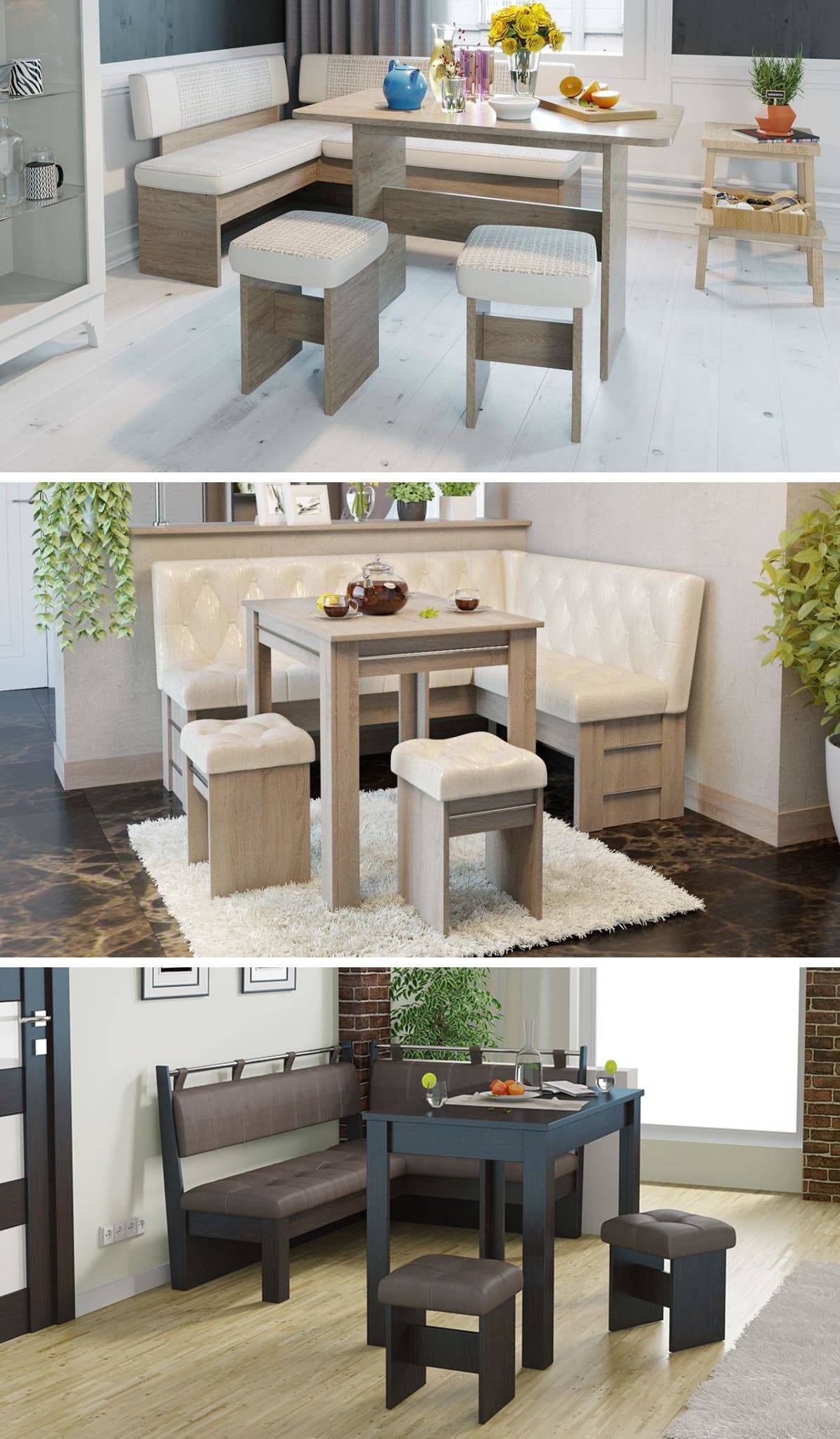 Такой вариант позволяет обходиться без стульев. Могут использоваться небольшие табуретки, легко размещающиеся под столиком.