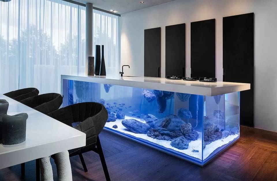 Островной стол на кухне, одновременно являющийся аквариумом, навряд ли потребует дополнительного декорирования. Аквариумом становится фартук на кухне. Оттуда рыбки будут наблюдать за манипуляциями хозяйки на рабочем столе.