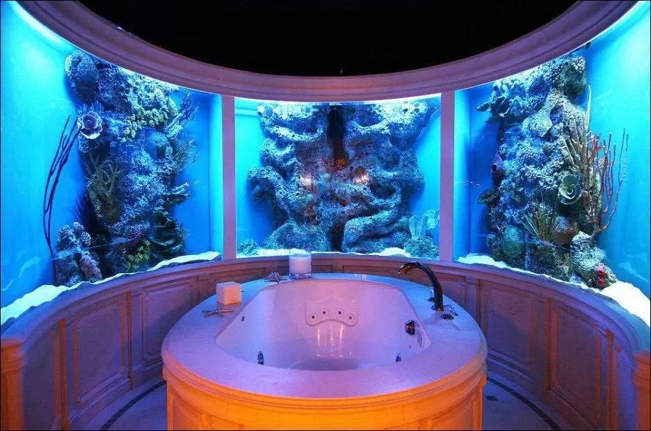 По всему периметру ванной выполняется стена в виде аквариума. Стены помещения с водной зеленью и обитателями создадут иллюзию погружения.