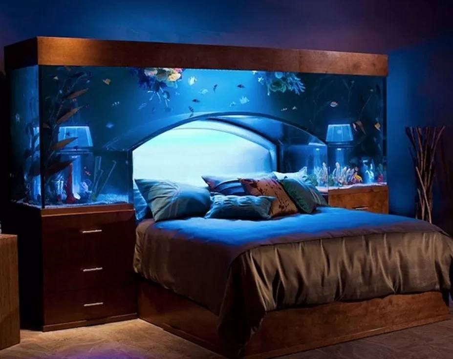 Любители покоя, уюта и волшебного подводного ландшафта устанавливают аквариум в спальне.