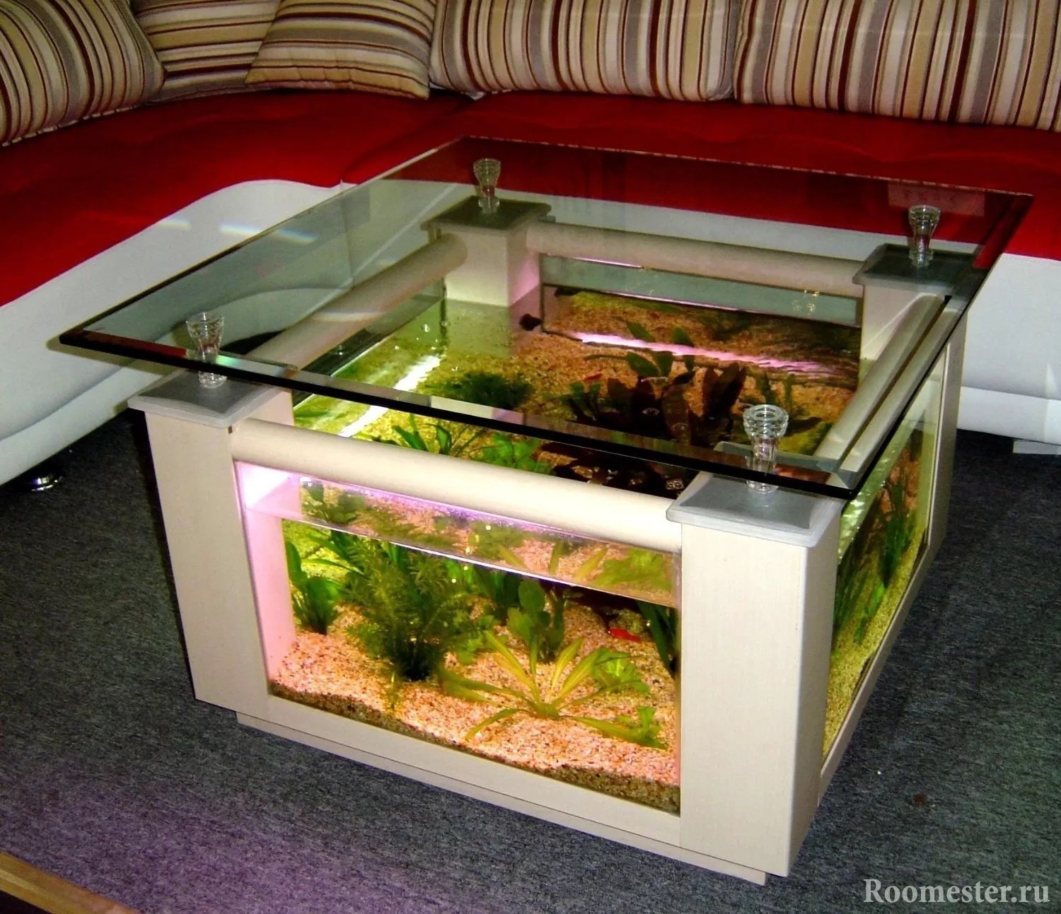 Стол в гостиной, частью которого будет современный аквариум, станет визитной карточкой вашей квартиры. Емкость с морскими водорослями, камушками, рыбками станет украшением загородного коттеджа, подходит для любого стилевого направления.