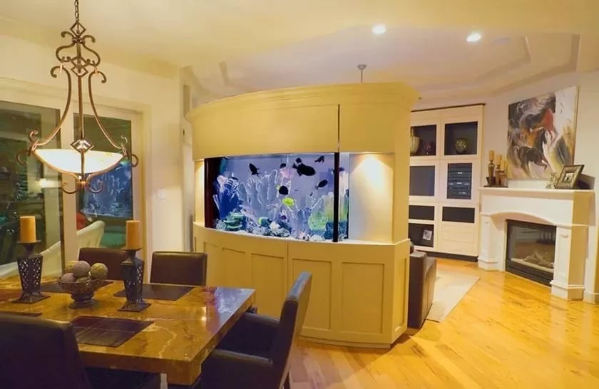 Если вы не хотите, чтобы через аквариум просматривалась соседняя комната или поступал свет из нее, то сделайте в его центре перегородку, оставив по краям просветы, чтобы рыбы могли беспрепятственно плавать. Этот же вопрос можно решить и при помощи декоративных элементов. Но такое решение подойдет лишь для небольших резервуаров.