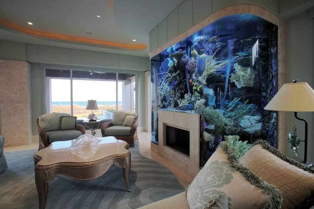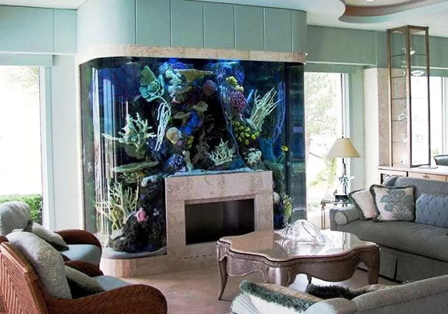 В гостиной аквариумы монтируют в стенке, с двух сторон от телевизора. Время от времени отвлекаясь от динамичного действия на экране, можно расслабиться, разглядывая подводный мир. Аквариум устраивают из самого телевизора, вынув из старого отслужившего ящика начинку и вставив вместо него соответствующую размерам колбу с морскими обитателями. Своеобразное «видео» для отдыха домашних и гостей.