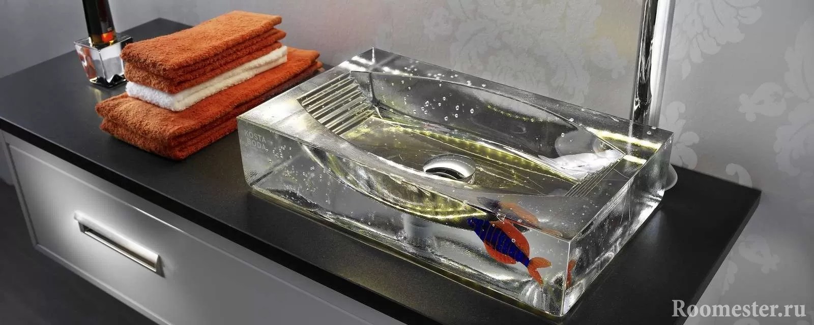 Можно заказать необычную раковину, которая объединит в себе раковину для посуды и подставку – аквариум. Минусом такой необычной конструкции будет проблематичный уход.