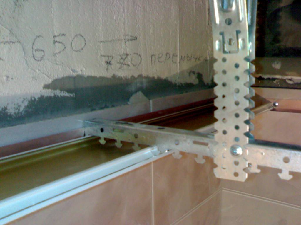 Далее крепятся подвесы. Первый на расстоянии около тридцати сантиметров, последующие через каждый метр. Все подвесы должны быть расположены параллельно друг другу.