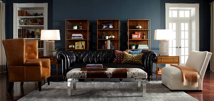 Почетное место занимает диван в английском стиле Честерфилд, который может быть выполнен в различных интерпретациях. В качестве обивки применяются тканевые полотна в разной цветовой гамме или натуральная кожа оттенка темного шоколада.