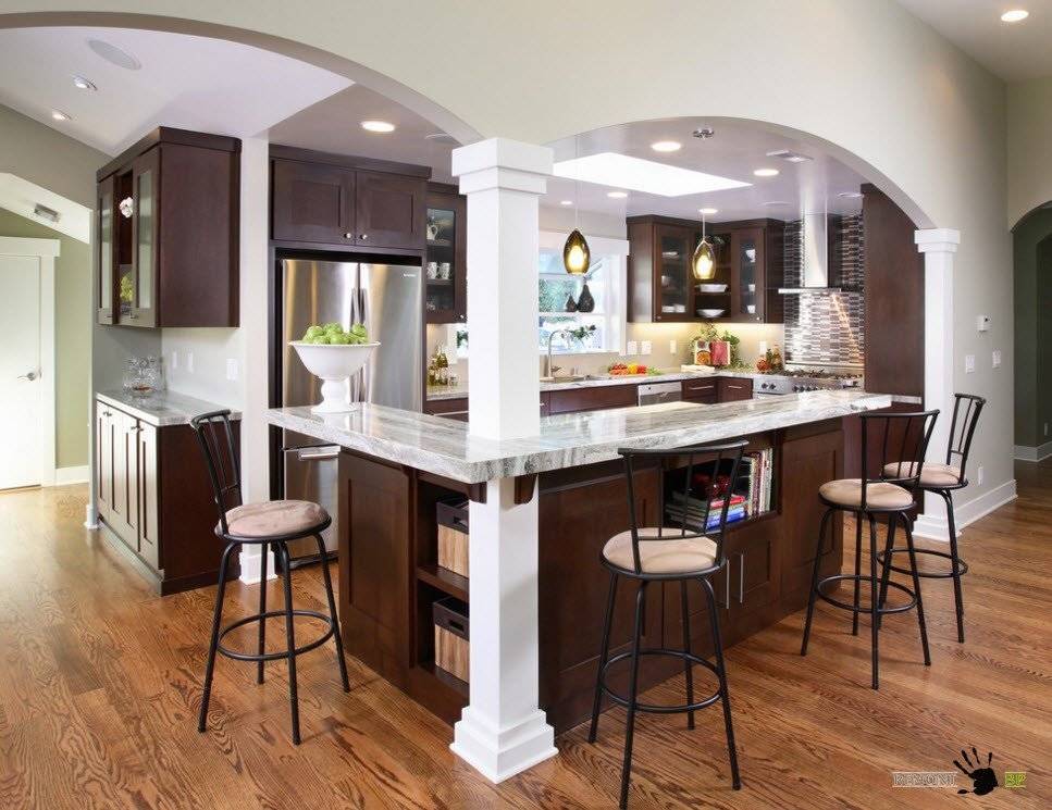 Отличный способ обособления кухонного пространства без сокращения полезного пространства помещения – использование арки-эллипс с колоннами.