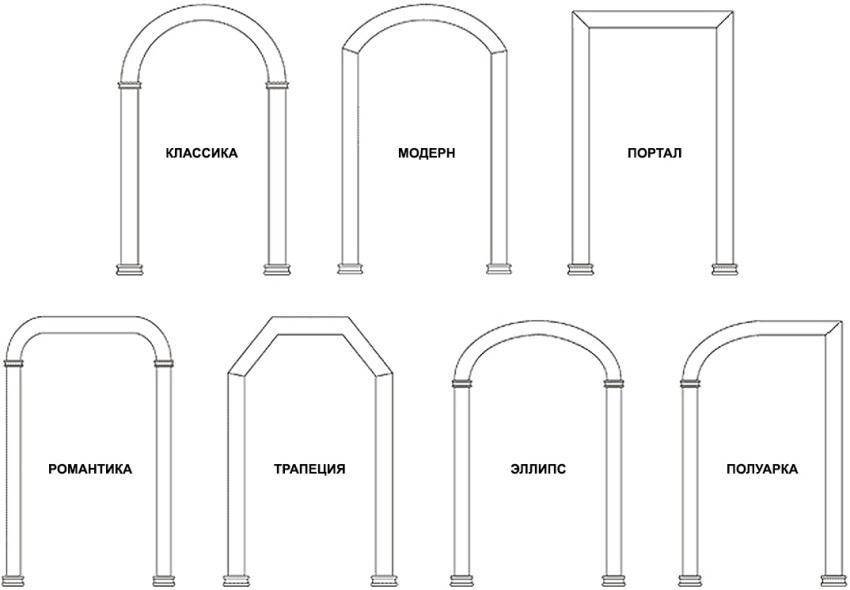 Межкомнатные или коридорные арки могут иметь разную форму. Отличаются они в основном формой верхней части и иногда — способом соединения с вертикальными частями. Основные их виды представлены на фото.