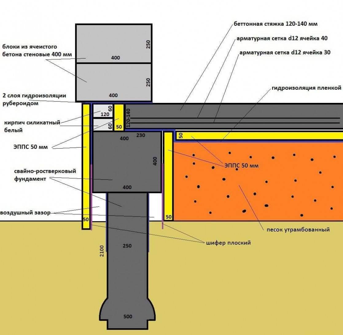 - заглубленными (основательно погружаются в землю; выполняют не только связующие функции, но и участвуют в распределении нагрузок на грунт наравне со сваями).