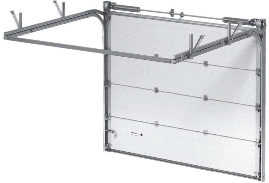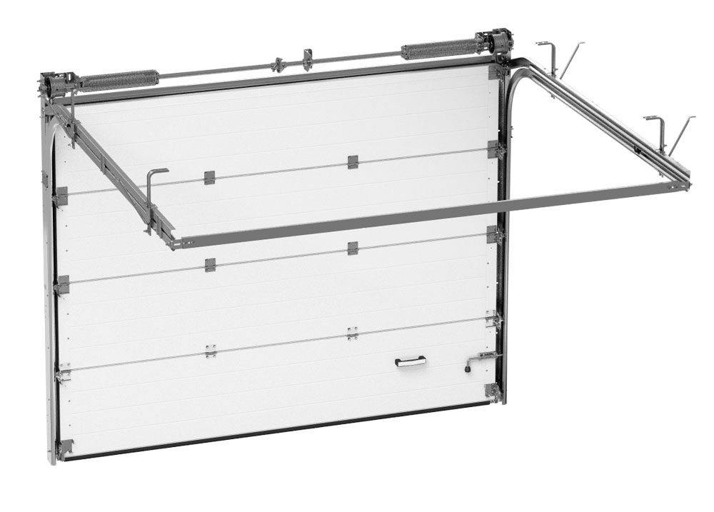 При открытии ворот задействуется роликовый механизм и подъемные рычаги, с помощью которых створка ворот движется по направляющим, а затем фиксируется под потолком гаража. Нижняя часть полотна поднимается вверх и образует козырек над проемом гаража. Компенсационные пружины в закрытом положении ворот растягиваются, а при открытых воротах остаются свободными.