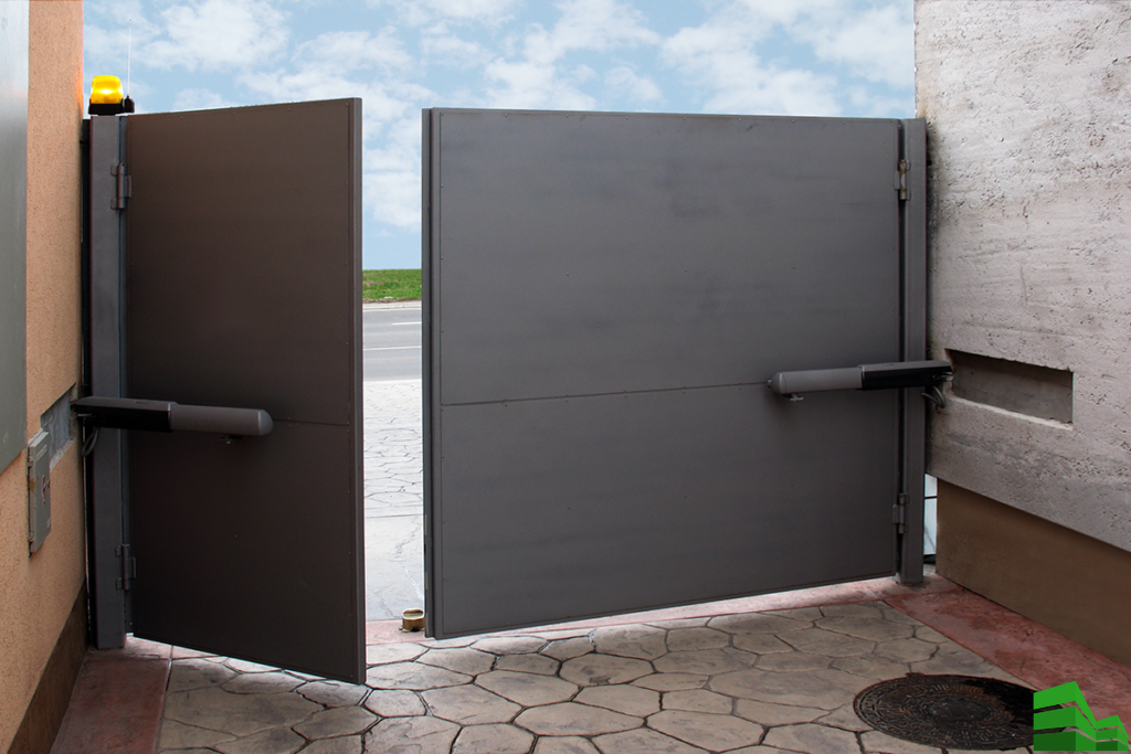 Существует несколько видов механизма. Первый из них мы рассмотрим – распашной автоматический тип. Конструкция состоит из двух створок, закрепленных шарнирным методом. Они распахиваются внутрь и наружу.