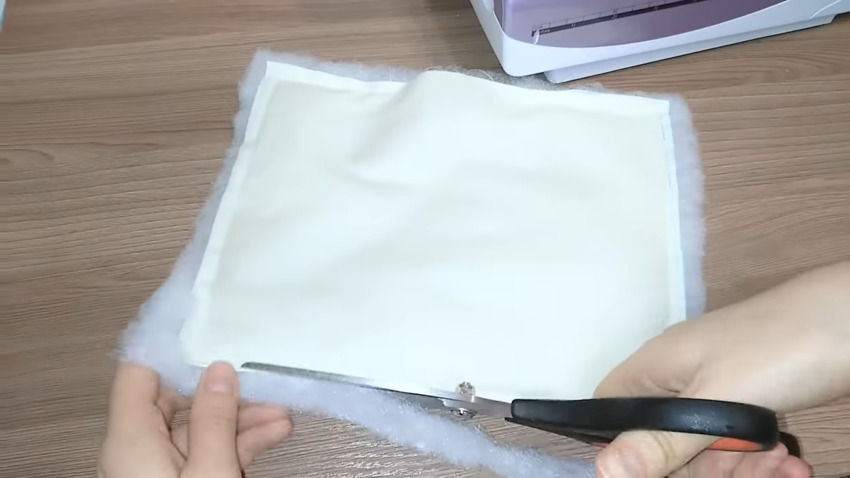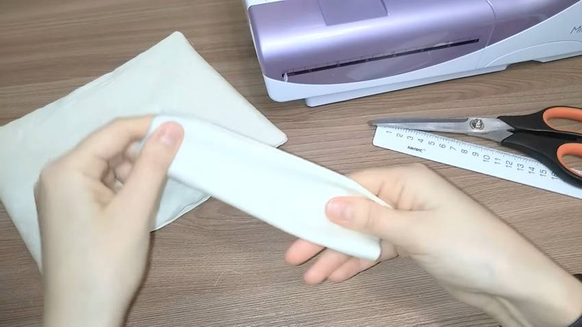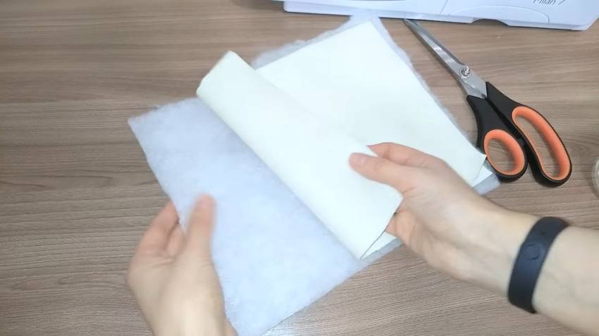 | 13 | ![]() | Срежьте оставшийся синтепон по бокам и уголки. После этого выверните получившуюся деталь. Затем подготовьте отрез ткани (сатина) размером 12*16 см, который будет выполнять роль хлястика для банта. |