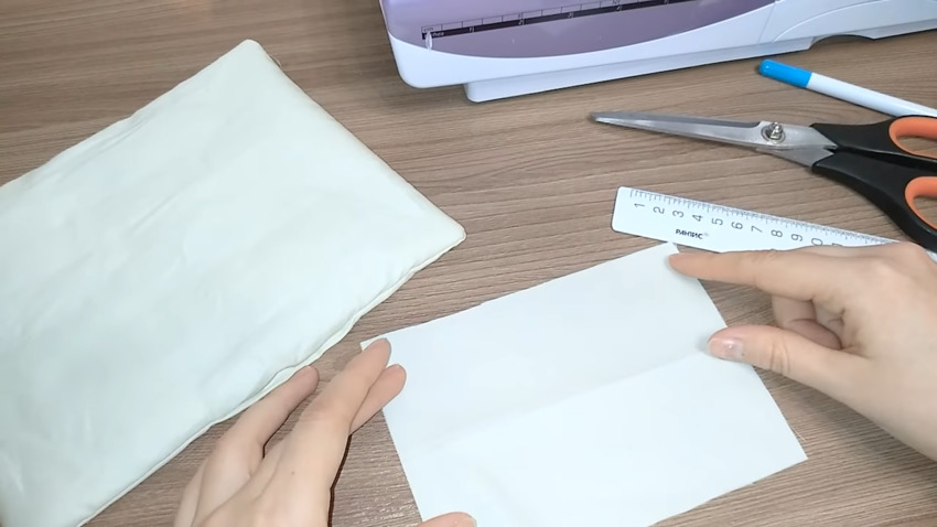 | 3 | ![]() | Оставшуюся ткань сложите пополам и сделайте выкройку для бантика размером 20*25 см. |
