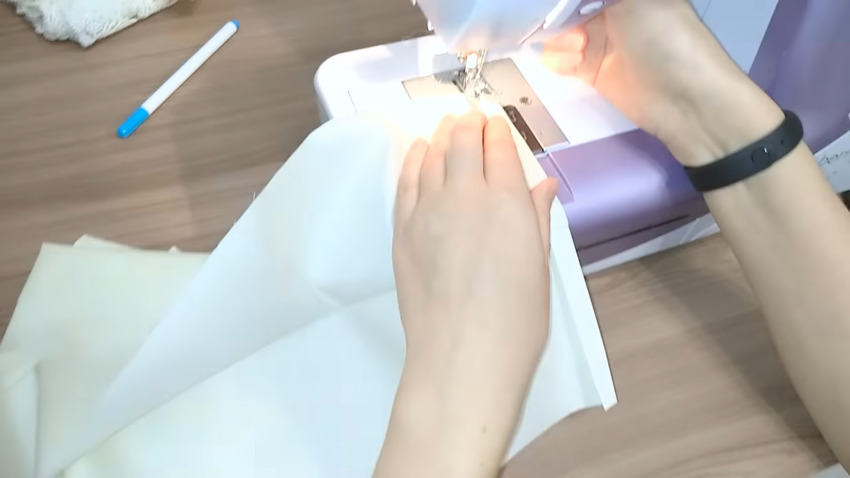 | 12 | ![]() | Сшейте обе части, проложив строчку на швейной машине по всему периметру, оставляя небольшое отверстие снизу. Для удобства предварительно можете зафиксировать ткань булавками. |