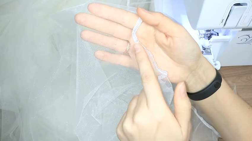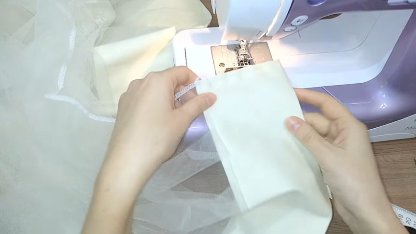 Прокладываем строчку на расстоянии1 см от края. Тщательно контролируем место соединения. Вуаль по всему шву должна оказаться внутрь складки. Аналогичным образом соединяем правую часть. 22