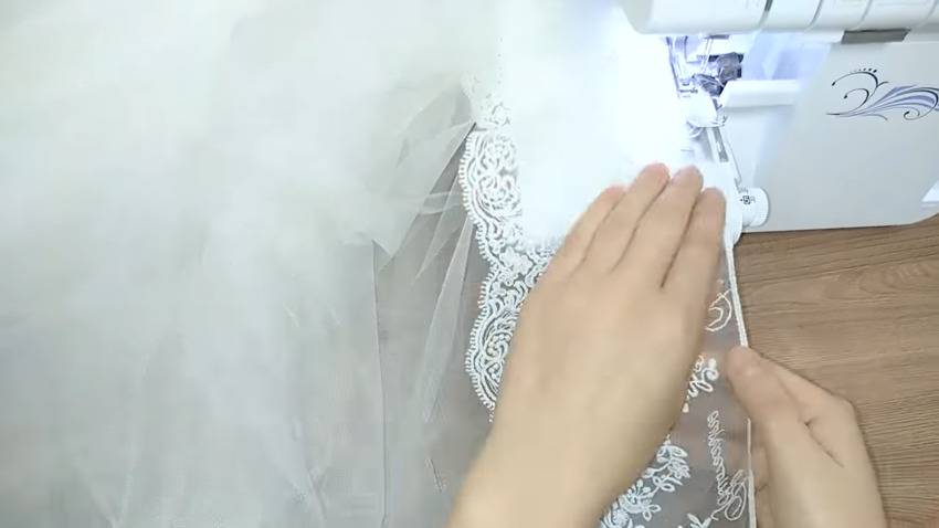 | 5 | ![]() | Затем пришейте кружево к основанию балдахина (по 180 см на каждую сторону навеса), используя оверлок. Для этого приложите кружево к шторе лицом к лицу и аккуратно обработайте края. |