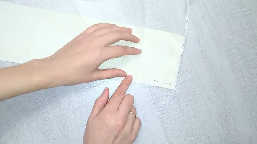 Вшиваем подготовленный хлястик в швы кулиски. Сначала в верхнюю часть. Фиксируем иголкой хлястик, немного присбаривая, чтобы его нижняя часть соответствовала нижнему шву. Пришиваем. 28