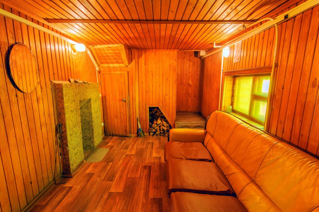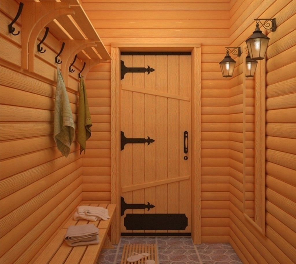 Предбанник оборудуют по своему вкусу, как обычную комнату. Следуя общей концепции – обшиваем вагонкой, в том числе хвойных пород. Вагонку обрабатываем пропиткой и антисептиком. Керамическая плитка отлично подойдёт для обустройства пола и области топки печи.