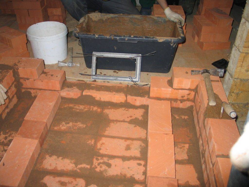 На монолитное основание устанавливаем металлическую печь – каменку. На каменке предусматриваем место под камни для образования пара и нагрева воды в ёмкости для купания. Печь в районе топки обкладывается кирпичом во избежание контакта с пеноблоками. Красим печь негорючей краской. Дымоход накрывается колпаком.