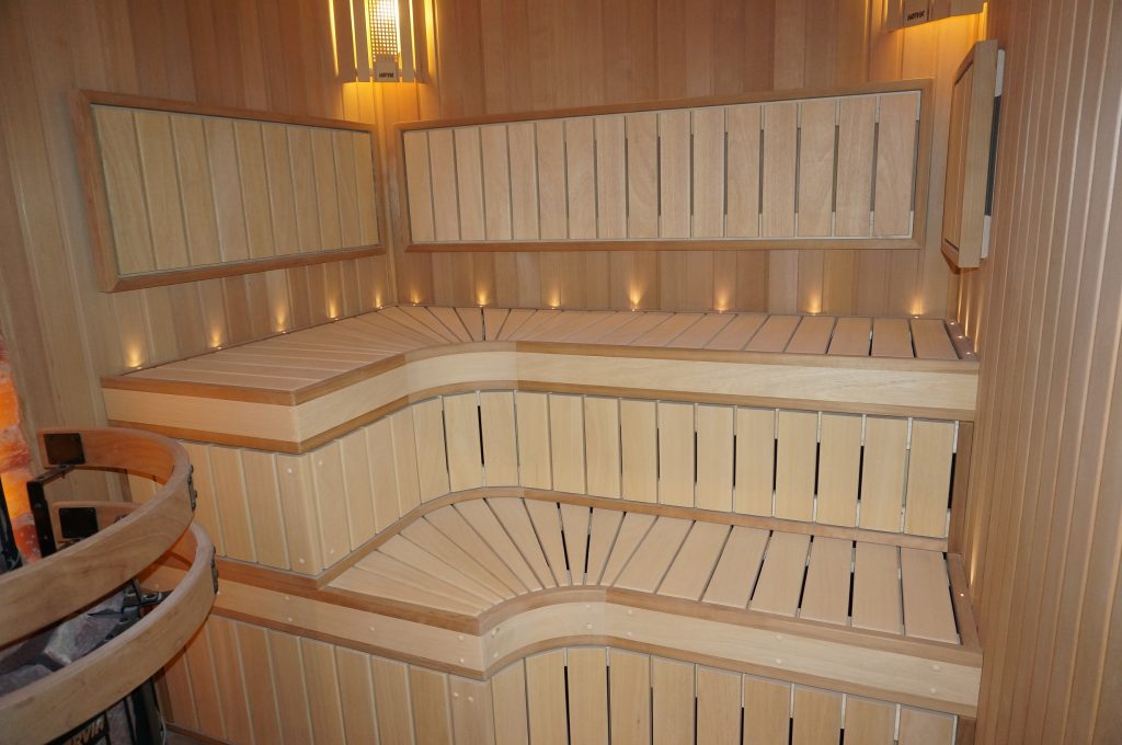Полки лучше всего делать дубовыми из 50-миллиметровыых досок и ставить их несколько ярусов – чем выше, тем жарче. Разные люди любят разный пар, и на самом верху температура может подняться до 100-120⁰C, тогда как внизу она может быть всего 70-80⁰C.