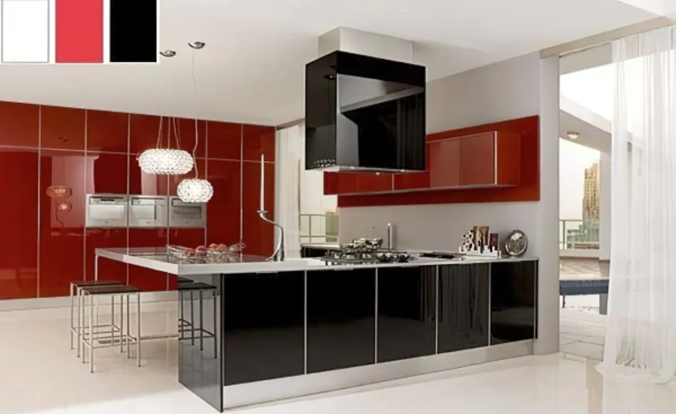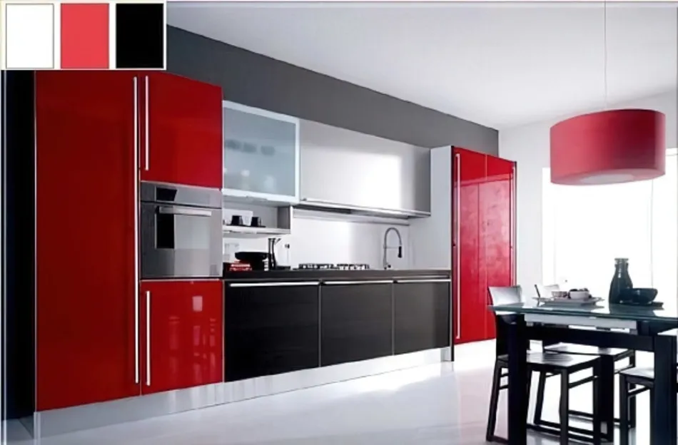Даже в кухне красный присутствует как сопутствующий, но не основной