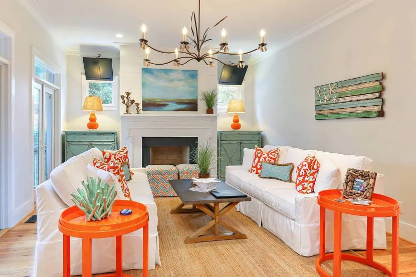 Оживить интерьер можно яркими акцентами (текстиль, декор, растения).