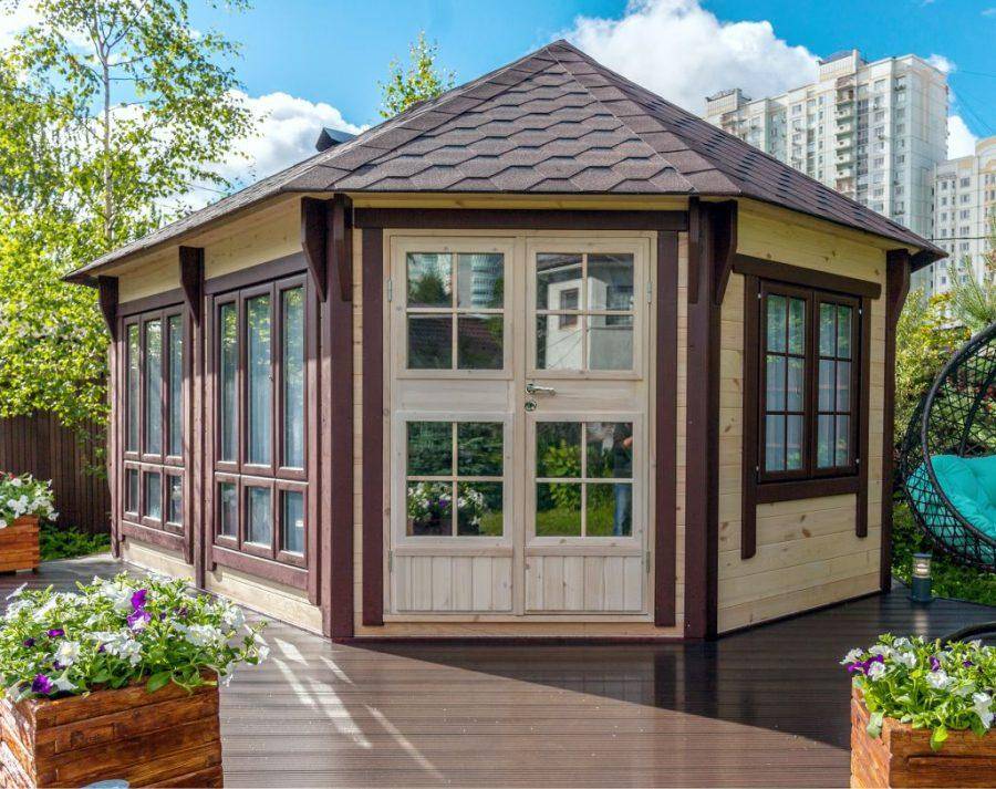 Для беседки закрытого типа необходимо будет заказать дверь и оконные конструкции, которые необязательно должны быть со стеклопакетами, вполне достаточно будет использования обычного стекла. Тем более что в таком случае их вес будет меньше, а значит, не создадут нагрузки на несущие конструкции, к тому же их демонтаж (при необходимости) на летний период не будет представлять особой сложности.