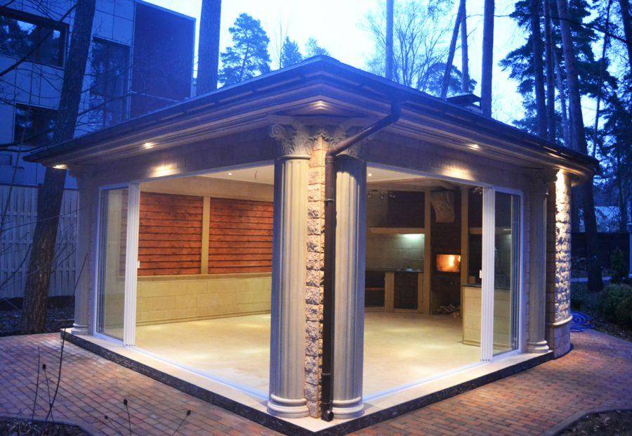 Еще одной причиной для выбора кирпича в качестве материала для строительства таких беседок, является возможность их всесезонной эксплуатации, поэтому возводить их следует как капитальные и обязательно устанавливать оконное остекление, с возможностью его демонтажа на летний период.