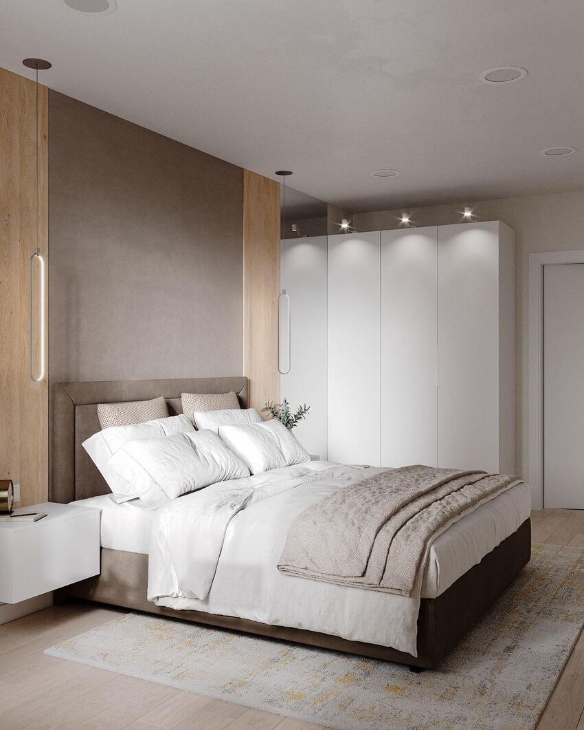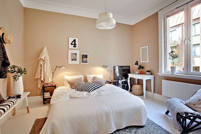 Спальня приветствует любые оттенки коричневого цвета, в том числе умиротворяющий бежевый. Он не только расслабляет, навевая мысли о мягких подушках и одеялах, но также создает ощущение чистоты, а его нейтральный характер, лояльность к тонам и теплым, и прохладным, позволяет быстро менять атмосферу.