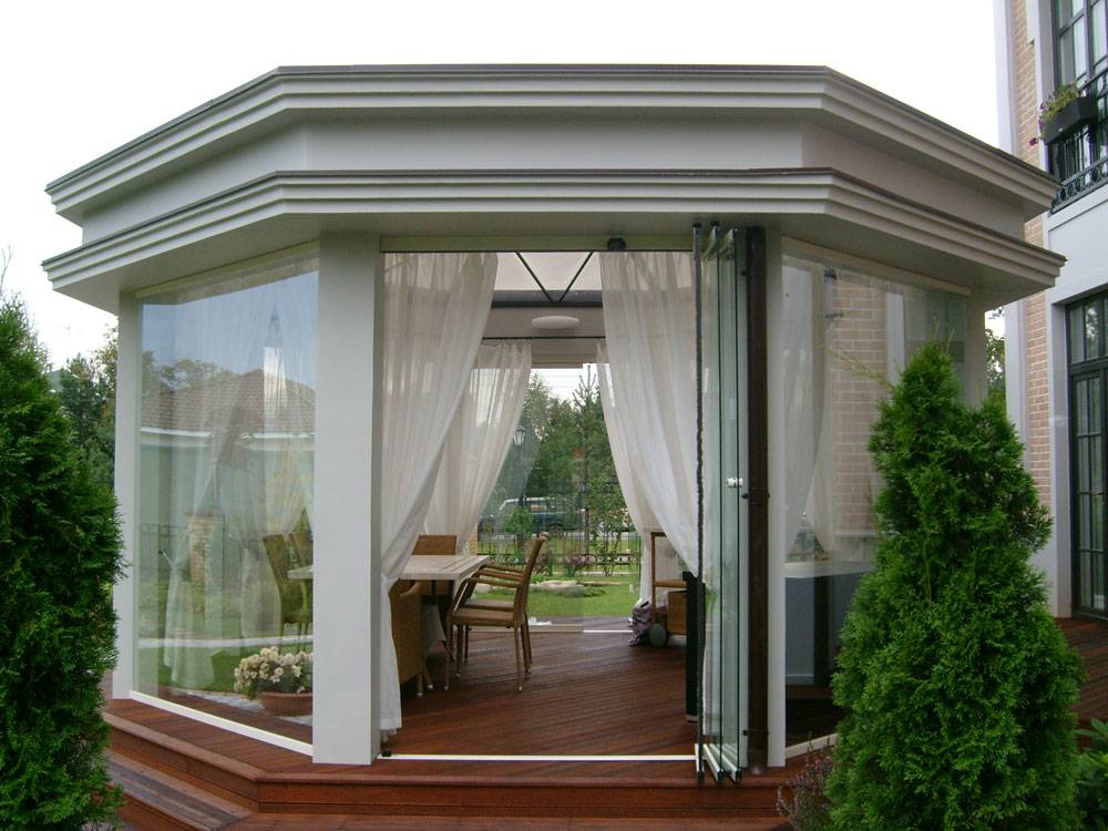 Она проектируется в существующем здании со стороны стенки, выходящей на улицу. Также веранда может быть пристройкой к дому. Её особенностью является то, что от уличного пространства она ограждается стекольным покрытием. Плюс в том, что стекло не будет препятствовать слиянию с природой и наслаждению её видами.