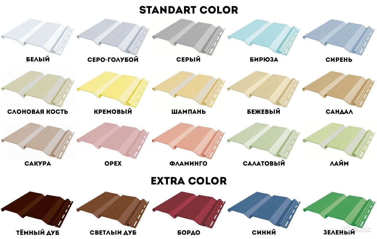 Стандартно виниловый сайдинг выглядит таким образом. Наиболее распространенные расцветки — бежевый, салатовый, слоновая кость