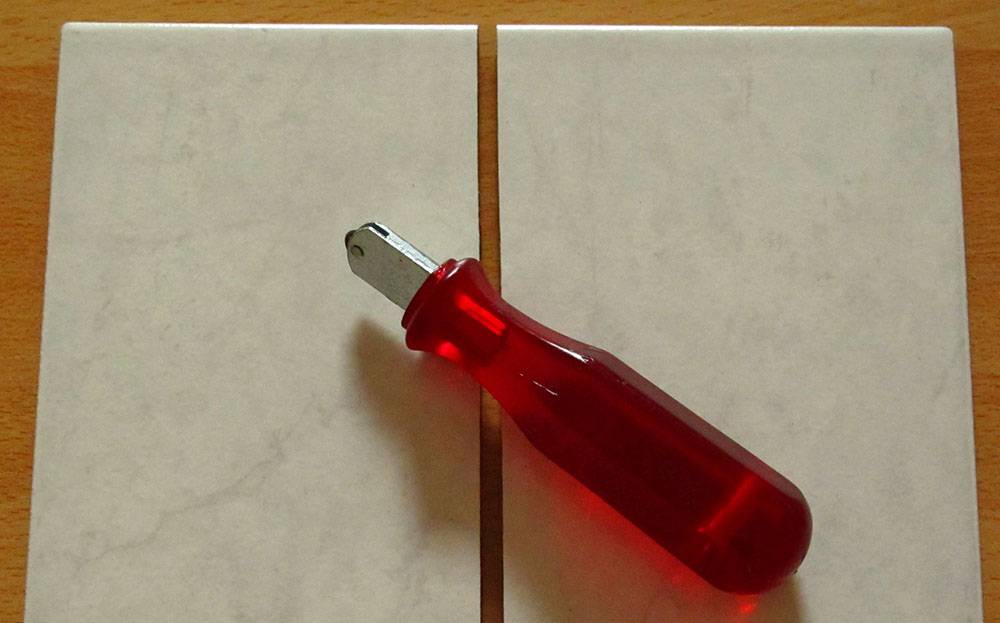 Есть и другой инструмент, которым надо пользоваться точно также. Это обычный стеклорез. Его алмазное колесико легко справится с глазурованной поверхностью, прорезав его насквозь. Главное, как и в случае с гвоздем, надо подрезку делать за один проход, приложив небольшое усилие на инструмент. После прореза надо постучать по плитке рукояткой стеклореза с двух сторон (лицевой и обратной). Таким образом, трещина углубится и ослабит структуру кафеля прямо по нанесенному срезу. Нередко такое простукивание становится причиной излома плитки по линии. Но чаще ее придется сломать, уложив на края стола.