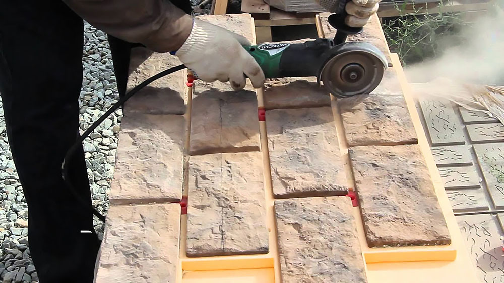 - Затем, по размеченной линии с изнаночной стороны прорезать канавку на глубину 2-3 см с помощью болгарки.