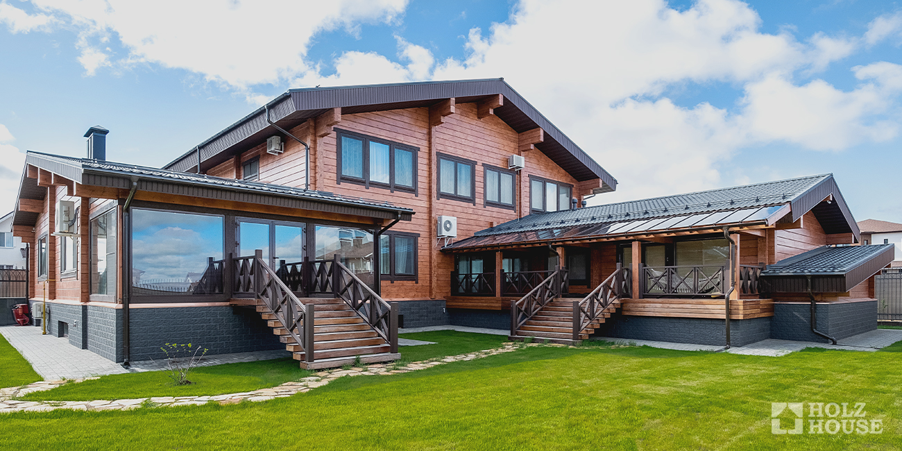 Иногда для закрытия цоколя используют дерево. Деревянную обрешетку монтируют по контуру основания, оставляя нижние планки на небольшой высоте от грунта. Натуральная древесина – экологичный и фактурный материал, но легко деформируется и выходит из строя под воздействием влаги, солнечных лучей и перепадов температур. Чтобы деревянный цоколь прослужил дольше, детали обрабатывают защитными средствами – антипиренами и антисептиками.