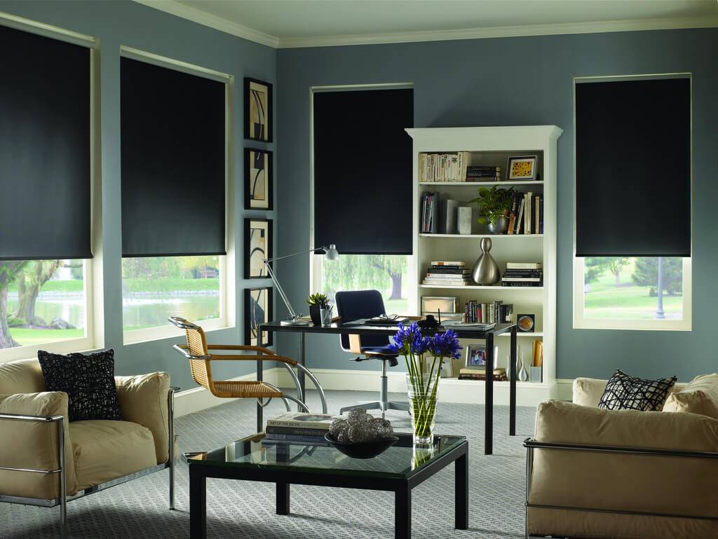 Черные шторы создают идеальную рабочую обстановку. В кабинете стоит отдать предпочтение жалюзи или тканям, полностью не пропускающим свет.