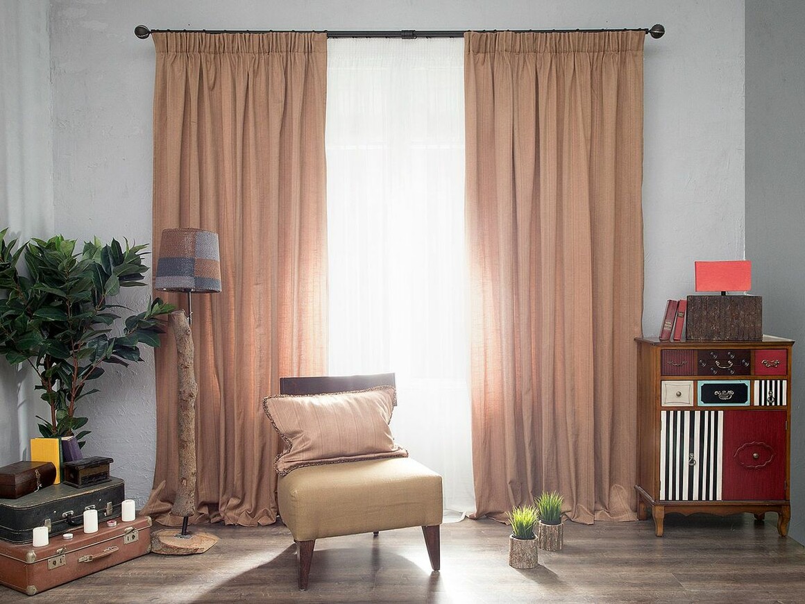 Розово-бежевый цвет штор теплый, нежный, спокойный.