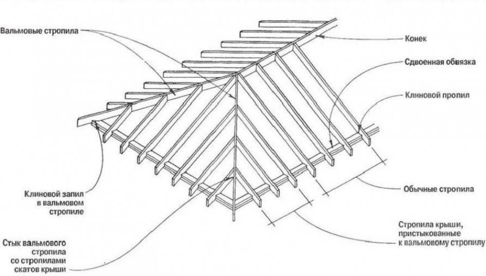 Схема устройства стропильной системы четырехскатной вальмовой крыши