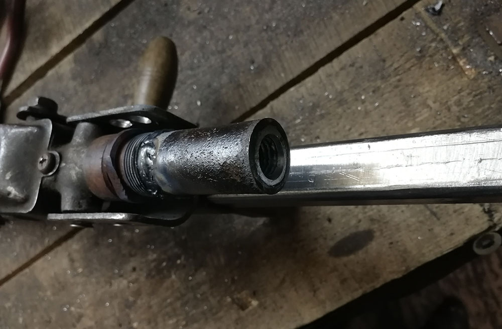 В основании стойки просверлено два отверстия для крепления столика и в них нарезана резьба М4. В самой штанге по центру симметрии с отступом от края отреза на 15 мм просверлено отверстие диаметром 10 мм под направляющий болт.